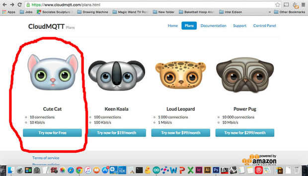 CloudMQTT es un broker MQTT que usaremos para host mensajes enviados desde nuestros teléfonos inteligentes. Para utilizar CloudMQTT, visita este enlace. Una vez en el sitio web, seleccione "planes" en la barra de navegación superior. Esto le llevará a una página con varias opciones de planes de hosting. Para nuestros propósitos el Gato lindo plan va a estar bien para lo que necesitamos para este proyecto.