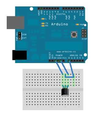 //declare variables float tempC; int tempPin = 0; void setup() { Serial.begin(9600); //opens serial port, sets data rate to 9600 bps } void loop() { tempC = analogRead(tempPin); //read the value from the sensor tempC = (5.0 * tempC * 100.0)/1024.0; //convert the analog data to temperature Serial.print((byte)tempC); //send the data to the computer delay(1000); //wait one second before sending new data } < / código >
