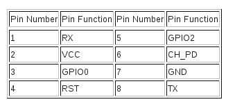 PIN número Pin función Pin Pin número función 1RX 5GPIO2 2VCC6CH_PD 3 GPIO0 7 GND 4RST 8TX