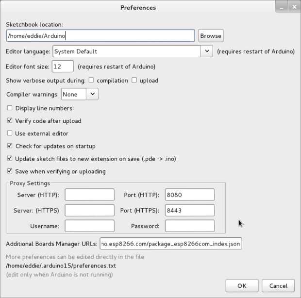 Iniciar Arduino y Perferences la ventana. Introduzca http://arduino.esp8266.com/package_esp8266com_ind... en campo adicional Junta administrador URL.