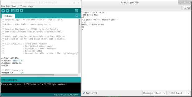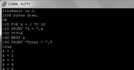 // TinyBASIC.cpp : An implementation of TinyBASIC in C // // Author : Mike Field - hamster // // Based on TinyBasic for 68000, by Gordon Brandly // (see http://members.shaw.ca/gbrandly/68ktinyb.html) // // which itself was Derived from Palo Alto Tiny BASIC as // published in the May 1976 issue of Dr. Dobb's Journal. // // 0.03 21/01/2011 : Added INPUT routine // : Reorganised memory layout // : Expanded all error messages // : Break key added // : Removed the calls to printf (left by debugging) #ifndef ARDUINO #include "stdafx.h" #include <conio.h> #endif f //<<<<<<<<<<<<<< remove the letter "f" // ASCII Characters #define CR '\r' #define NL '\n' #define TAB '\t' #define BELL '\b' #define DEL '\177' #define SPACE ' ' #define CTRLC 0x03 #define CTRLH 0x08 #define CTRLS 0x13 #define CTRLX 0x18 typedef short unsigned LINENUM;