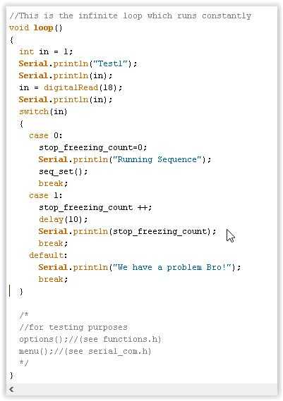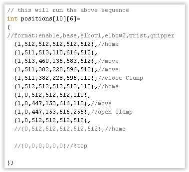 1. poner las posiciones de servo que encontrado desde antes en la matriz. Primer valor de la matriz es permitir el paso de la posición. Utilice 1 para activar y 0 para desactivar.