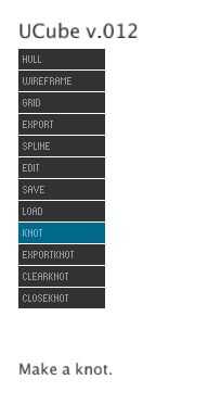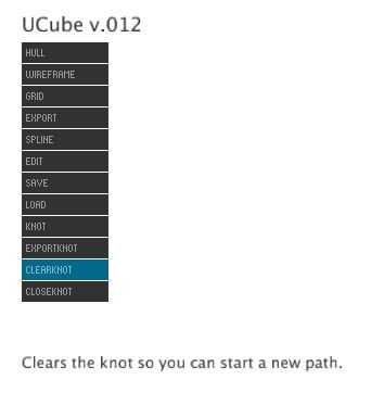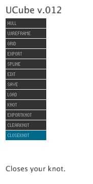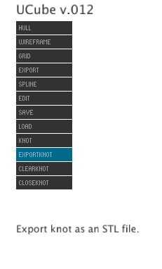 El nudo modo le permite grabar una secuencia de puntos seleccionados en el UCube y dibujar un trazado de 3D esos puntos de conexión. En primer lugar, seleccione el botón de 'nudos' de la barra lateral (ver fotos en el paso). A continuación, activar (en secuencia) los puntos que desee el nudo a seguir - el software va a construir el nudo en tiempo real en la pantalla. Si usted comete un error o cambia de opinión, puede Pulse el botón 'borrar nudo' y comenzar de nuevo. Si desea un tipo de bucle cerrado de nudo, clic en el botón de 'cierre nudo' cuando termines modelado. Ahora está listo para exportar su nudo y STL archivo e imprimir! Dulce!