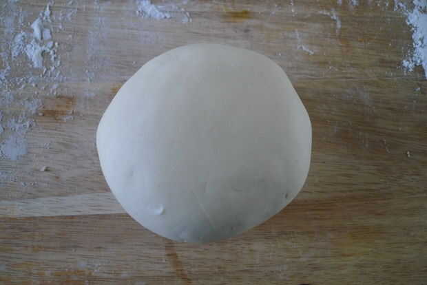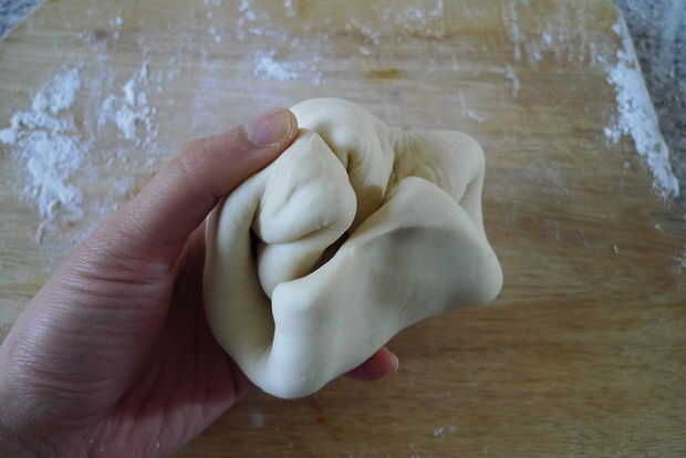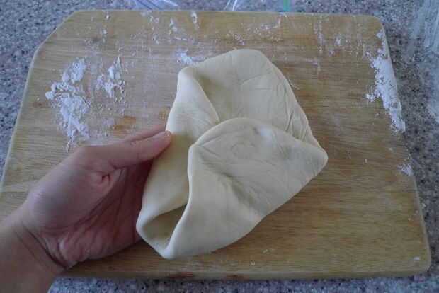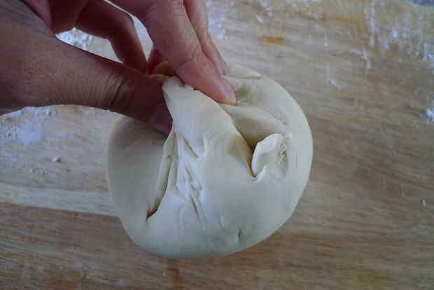 Doble los extremos de la masa, tirando de ellos hacia el interior. Pellizque los extremos de la masa juntos y voltear la masa. Trabajar la masa con las dos manos para formar una bola-como forma. No tiene que ser perfecto.