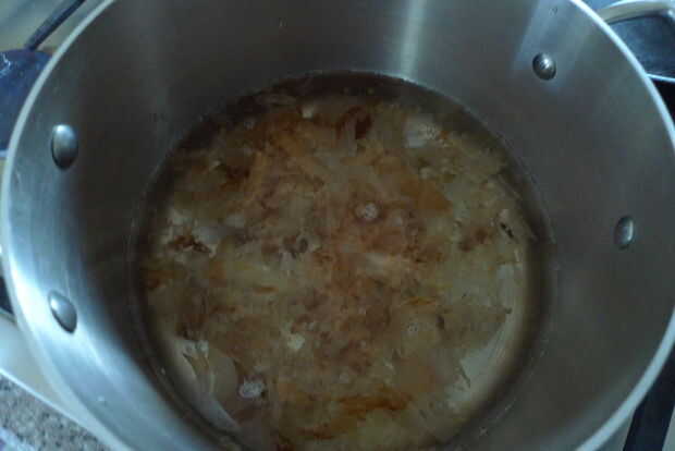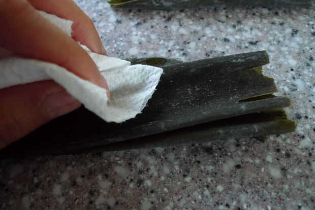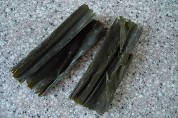 Poner el agua en una olla grande. Sacar dos trozos de alga konbu seca. Tome una toalla de papel o un paño para limpiar algunos de los residuos de exceso en el konbu. Caer en la olla. Gire la llama a fuego lento y deje el konbu en el agua durante 10-15 minutos. No quiero poner el agua a hervir porque el alga konbu comenzará a obtener baboso.