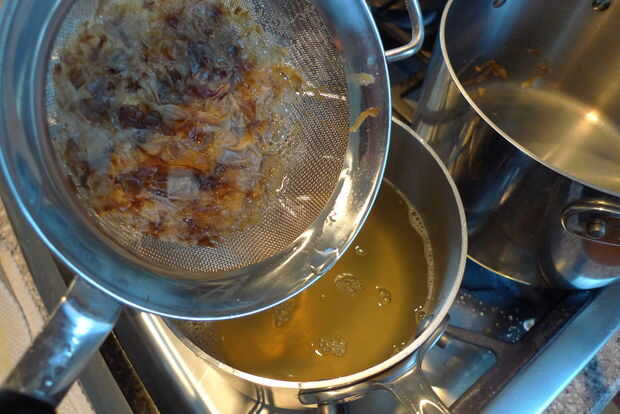 Retirar el alga konbu. Añadir los copos de bonito y gire el calor hasta el alta. Dejar hervir durante 5-6 minutos. Colar los copos de bonito.
