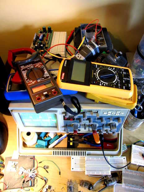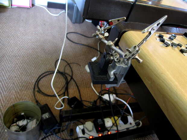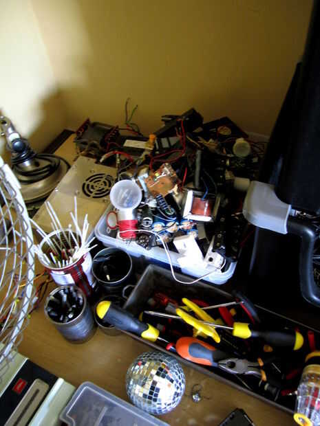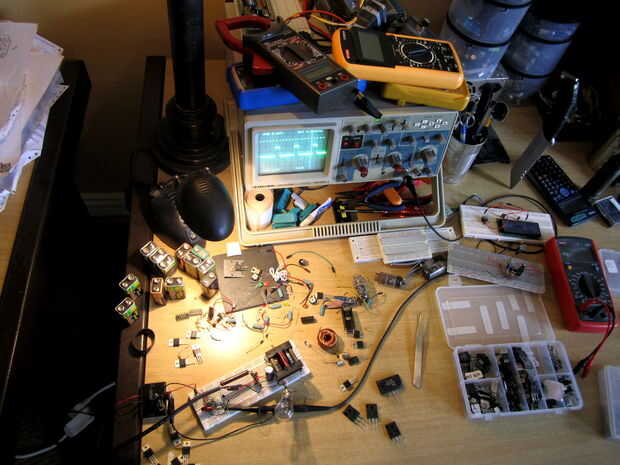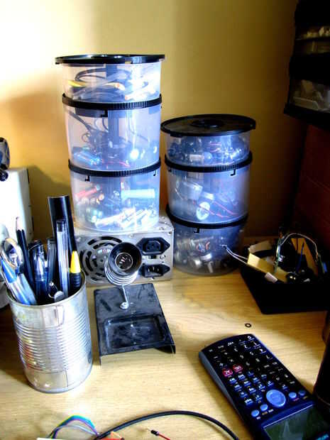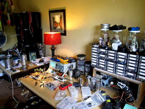 Prácticamente todo lo que ves fue, hasta no hace mucho tiempo, embalado en un solo escritorio en mi habitación. Pero debido a la falta de espacio, ya que así como el pensamiento de lo que la soldadura humos y llevar polvo poco a poco están haciendo a mí mientras duermo, me movía todo mi equipo a este lugar.