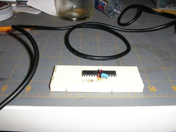 Poner el ATmega168 en el protoboard, a caballo entre el centro.