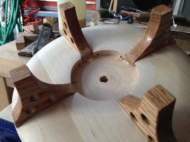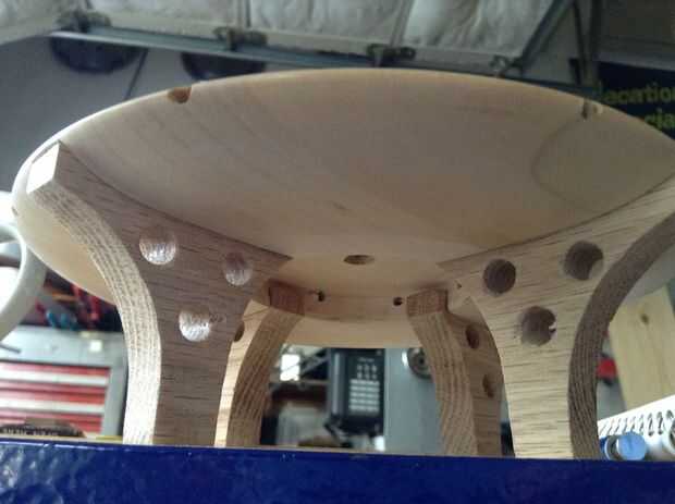 Primero hice una plantilla pequeña para el aterrizaje. Esto fue simplemente dibujado a mano cortado y lijado. También se colocan tres pequeños orificios para permitir que me transfiera la ubicación del agujero para las piernas.