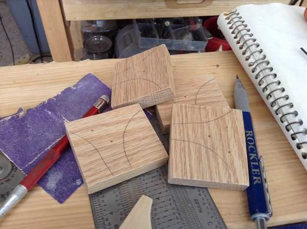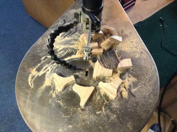 Luego corté las piernas a 2" x1.5". Transfiera las ubicaciones de plantilla forma y agujero para cada pata y recortar con una sierra de cinta o una sierra de contornear. Luego perfore los agujeros en las piernas.
