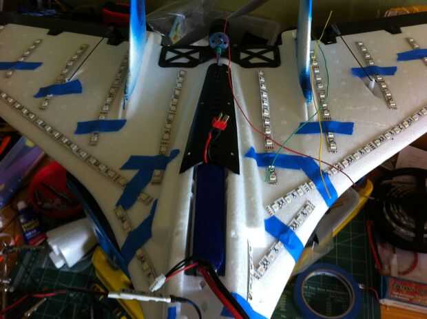 Corte para adaptarse a las luces LED. Estas luces tenían puntos de corte y soldadura pastillas cada tres LEDs. Pone hacia fuera en un patrón que proporcionará cobertura de Eva. Mantener en su lugar con cinta de pintor. Es baja adhesividad y puede cambiar de posición un par de veces.