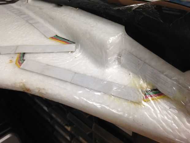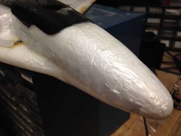 usé un laminado claro documento llamado Doculam para mantener todo en su lugar después de la grabación. Se trata de buena capa protectora resistente que envuelve a los contornos bien. Se aplica con una plancha de calentamiento. Si te fijas bien puedes ver la "luz de maíz", apuntando a las aletas de la cola de la zona central. También hay dos luces de maíz rojo en la espalda para ver como después de quemadores.