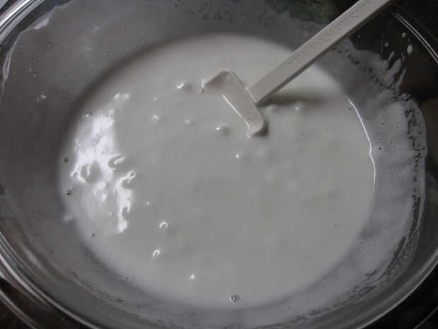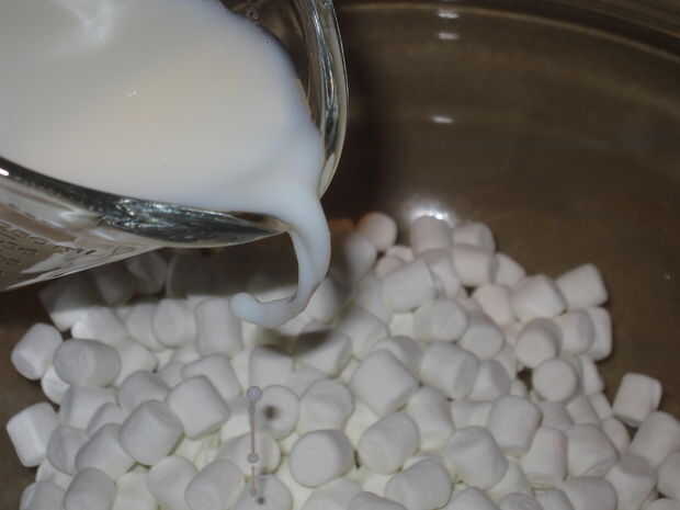 Verter la leche sobre las melcochas y coloque en el microondas en alto por 2 minutos. Retire y mezcle. Cocinar 30 segundos adicionales en un tiempo, luego revuelva, hasta que los malvaviscos se derritan. Dejar de lado que se enfríe.
