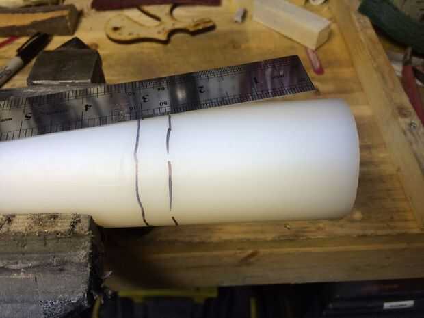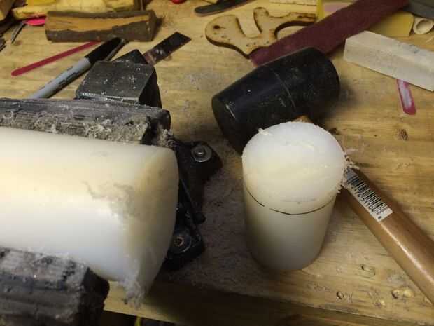 En primer lugar, vamos a reducir la población de martillo golpear la cabeza. Un diámetro de 2.5 polietileno de peso Molecular Ultra alto no hará el truco, tonta nylon o polietileno de alta densidad, este material es las rodillas de la abeja en cuanto a peso y durabilidad. Un 3.5″ saludable fue cortada desde el registro. Este material era resistente, vio incluso con mi madera más agresivo, mucho trabajo para que sea corte.