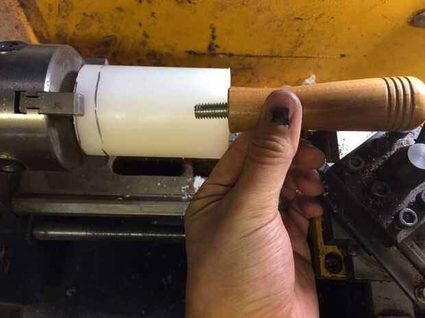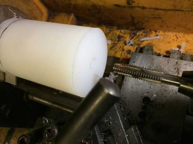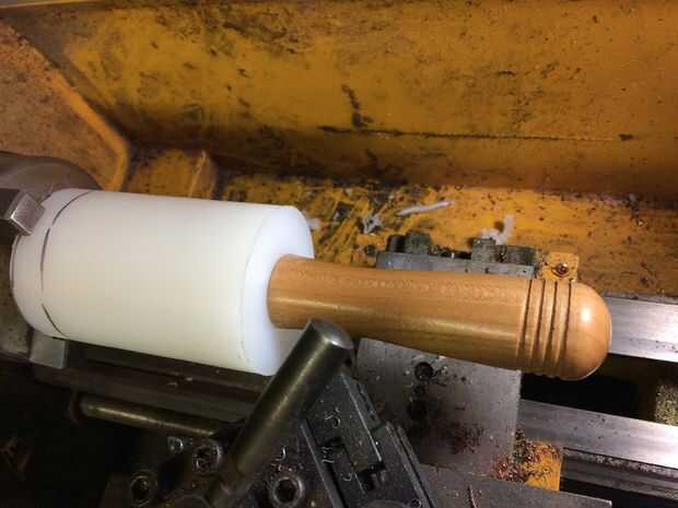 Me las arreglé para comprar un montón de mangos de la herramienta de herramientas de Lee Valley al escaso precio de $.50 cada uno. Vinieron todos listos para ir con una varilla de 5/16 rosca fina. Globo ocular la profundidad de la profundidad del agujero y la rosca. UMHW es dura, pero cede afiladas herramientas (llave, SHARP) fácilmente.