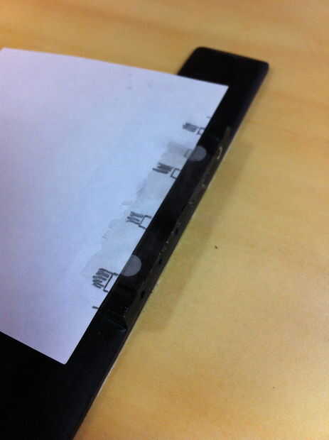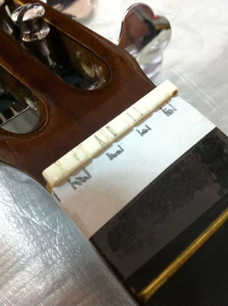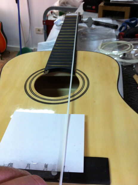 Hacer una plantilla en un trozo de papel con todas las medidas y cinta para el diapasón justo al lado de la tuerca y hacer lo mismo en el puente. Antes de la fijación de la plantilla de puente marca la línea central del lugar donde se atan las cuerdas.