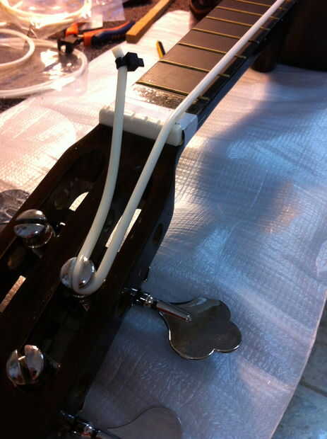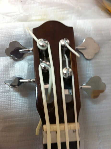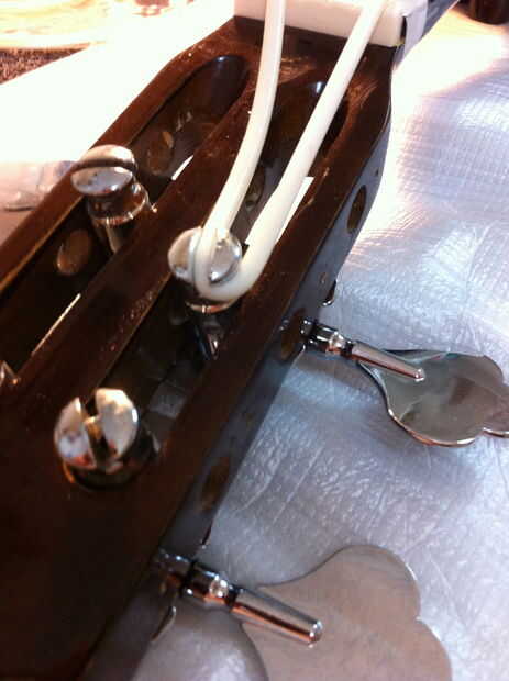 Las ranuras en los afinadores bajos no son lo suficientemente amplia como para la cuerda de 5mm así que tuve que presentar un poco. Después de alguna lucha, la cadena estaba dentro de la ranura de sintonizador con suficiente presión que asegura que no pueda resbalar o salir.