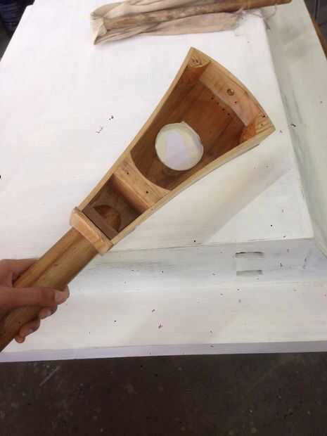 parte superior (debe tener un orificio grande unos 6 cm de diámetro para el agujero de sonido y cuatro agujeros pequeños 1 mm para las cadenas de),