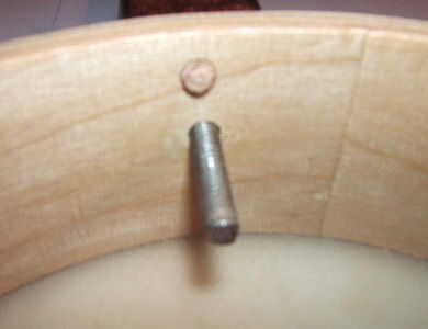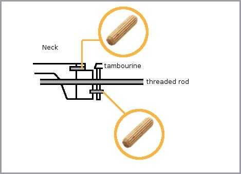 El tubo de aluminio se corta al tamaño exacto de la interno de la pandereta. Use arandelas en todas partes es posible (mejor aspecto y acabado y prevención de fijación suelta). Para terminar, las tuercas en la varilla roscada.