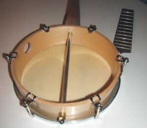 esencialmente se trata de una pieza de madera con una cabeza de tambor antiguo y algunas ataduras, era menos de 30$ para mí, y aunque no es una obra finamente rendir homenaje el original "banjos" que fueron hechas por esclavos en América tempran