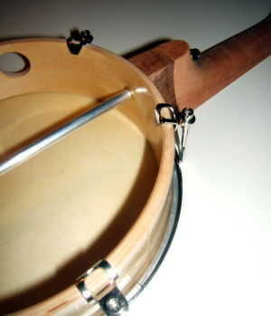 recientemente terminé haciendo un banjo un respaldo abierto 5-cuerdas de piezas baratas con un cuello de viejas cubiertas de laminado skate.Soy un impaciente participante en el Nottingham Hackspace Ukulele Orchestra y hay muy pocos proyectos de gran