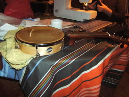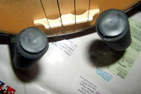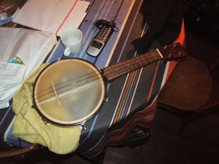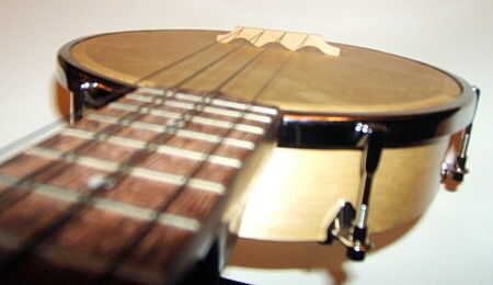 Opción, si quieres jugar tu ukulele banjo a través de un amplificador o P.A al actuar por ejemplo, puede conseguir un transductor piezoeléctrico atascado entre la piel y la "pata" central del puente. Funciona muy bien cuando está enchufado a una caja D.I o un búfer de cuadro de menta (http://www.scotthelmke.com/Mint-box-buffer.html)