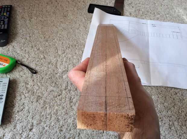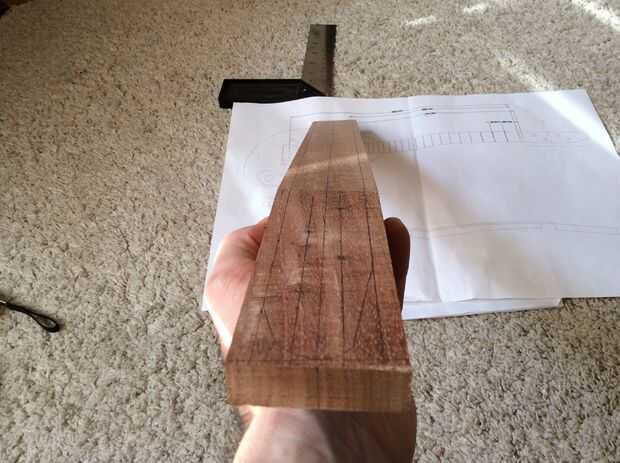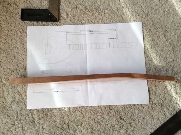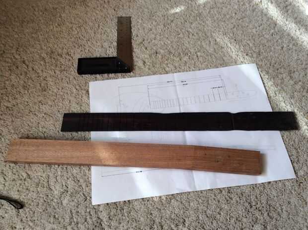 Mi plan en esta etapa es conseguir el diapasón y el cuello pegado hasta el corte con el tamaño correcto como una sola pieza. Una vez que se forma el cuello, te rebaje el bolsillo cuello y medir por la posición del puente.