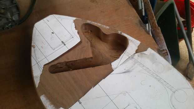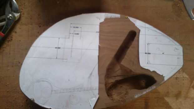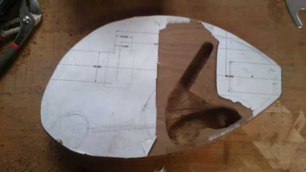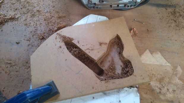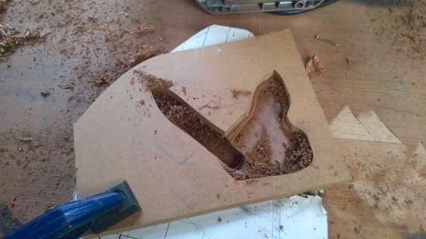 En una notable desviación de forma, hice realidad y utiliza una plantilla de crudo para la cavidad del cuerpo. Para ello que bosquejado la forma de la cavidad en el papel de la plantilla aún pegado al cuerpo. Luego esta había cortado y había trasladado a una pieza de 10mm MDF que recortar con la sierra caladora. Yo también no atendida en la forma o dimensiones como la pared lateral era suficientemente gruesa como para tomar los tallos de la olla (recuerda agujeros post Epifanía?), de lo contrario yo hubiera elegido un menos, erm, bien sabe usted, forma.