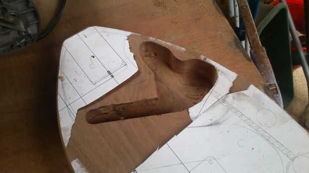 La plantilla fue clavada en el cuerpo en el bolsillo del cuello (que va ser cortado), gira sobre un eje en su lugar y todo el lote al Banco. Me sacó el router con el poco de plantilla y comencé la ruta. Porque el cortador de plantilla sólo sigue la plantilla cerca de profundidad I cuidadosamente sacó la mitad de la cavidad en pasos de 1-2mm de profundidad, o tan profundo como el router irá, luego trabajó mi camino de regreso a la plantilla. La nueva cavidad se reúne con la recogida de la cavidad y debe dejar espacio para el gubbins. Nota el estirón en la parte inferior de la cavidad, esto es para un tornillo scratchplate posteriormente.