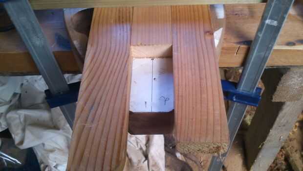 La cavidad final fue el peor - el bolsillo del cuello. Para hacer esto otra vez recurrí a mi poco fiel de la plantilla. Esta vez alineado el cuello en el cuerpo y comprobar la alineación, luego sujeta algunos recortes alrededor del cuello comprobando la alineación de todo el tiempo hasta que estuve satisfecho tenía razón. Adoptando el mismo enfoque como en la cavidad principal lentamente cavado lejos a profundidad (19 mm) luego trabajó hacia la plantilla. Esto fue muy bien. Excepto la alineación estaba equivocada. Ahora la línea del cuello es de una fracción de un grado por lo que el puente se tiene que mover hacia el sur. ¿Por suerte la forma es mi diseño, por lo que había planeado de esa manera no? Usted no puede probar diferentes, no es como usted ha visto los planes es. Oh...