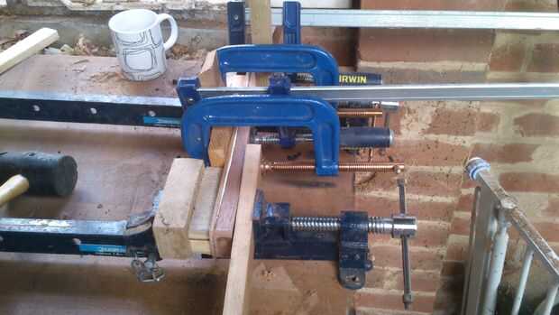 Ahora el cuello es de forma, ha llegado el momento de pegar el diapasón. Marcadas las líneas del centro del diapasón y el cuello y los alineados. Me abofeteó a una carga de cola y sujeta todo apretado durante la noche.