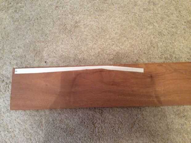Estoy seguro se forman en la magnitud de la tabla de sapele que había comprado y aquí está la plantilla de Perfil de cuello establecida en él para el corte. ¿La tabla es lo suficientemente ancha para la anchura del cuello por lo que sería más fácil cortar alrededor del perfil, ahora?