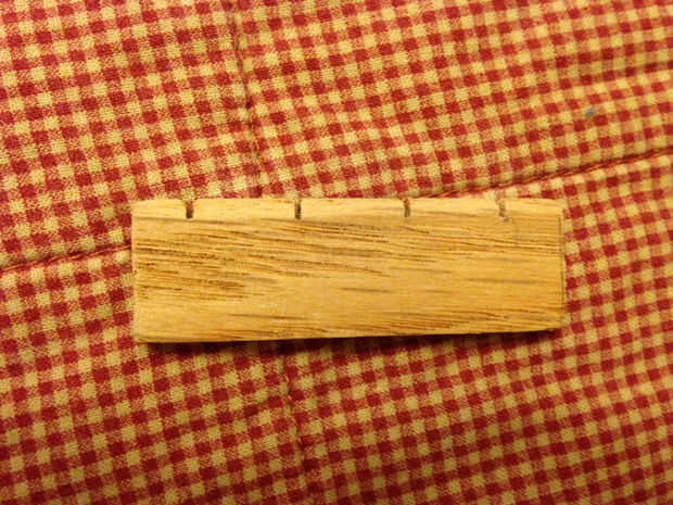 Otra vez con el roble, corte una pieza pequeña que es 2 x.5 pulgadas. Cortar esto por lo que la veta de la madera corre a lo largo (2 pulgadas) de la pieza. Este será el puente sí mismo. Con la sierra para metales, corte cuatro ranuras poco profundas en el puente - sólo un 1/16 de pulgada en la madera. Hacer estos cortes en las marcas.25 pulgadas,.75 pulgadas, pulgadas 1,25 y 1,75 pulgadas. Estos surcos pequeños ayudará a mantener las cuerdas uniformemente.