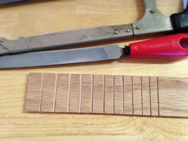 En primer lugar, marcar las posiciones del traste con un lápiz y luego con una sierra de mano corta iniciales ranuras para los trastes. Dependiendo del grosor del cable (u otro material de traste) que está utilizando, puede que necesite ampliar las ranuras con el archivo. (Si está manchando o sellando su ukelele / diapasón, que ahora antes de proceder al paso siguiente.)