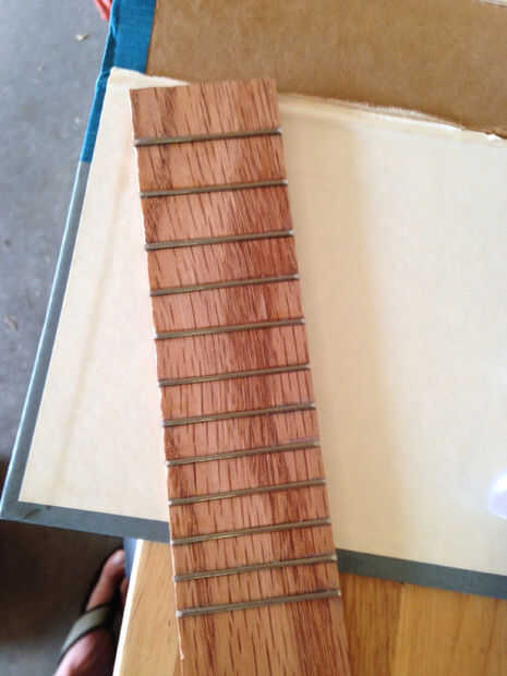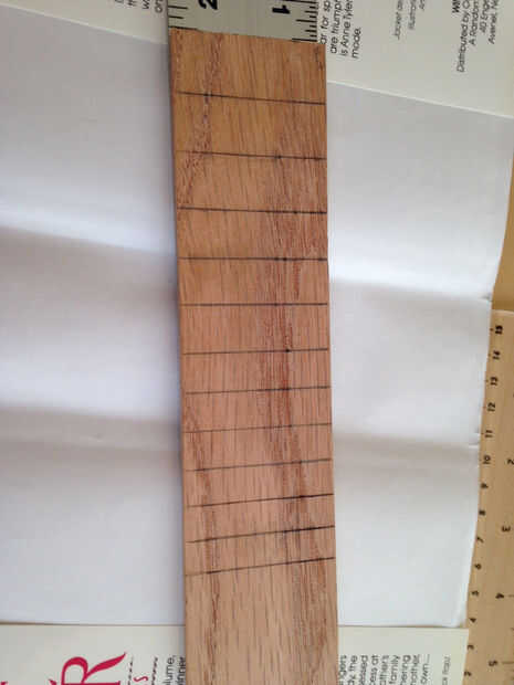 Construir el diapasón con la madera de roble de la manía. Cortar la madera a la longitud de la escala, más un adicional de 1 1/2 pulgadas. Usando una calculadora de traste (como esta), encontrar las medidas de sus trastes.