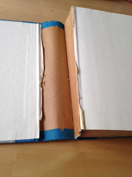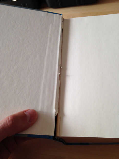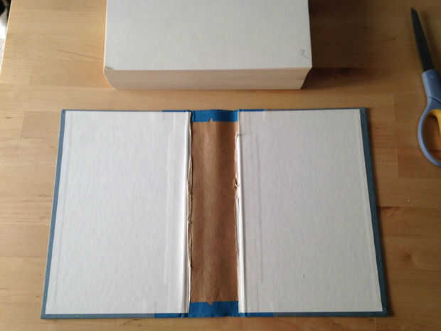 A continuación, cortar con cuidado las páginas del libro. Comience con la portada. Entre el interior de la tapa y la pila de páginas, normalmente hay sólo una gruesa pieza de papel. Con un cuchillo, corte cuidadosamente a través de esta tira de papel. Usted no quiere cortar a través de la columna vertebral de la portada del libro. Hacer cortes superficiales muy pequeños uno a la vez. Poco a poco usted cortará a través del papel y no a través de la columna vertebral. Una vez a través del papel puede ser una gota de pegamento. Como la tira de papel, tómese su tiempo y hacerlo lentamente. Repita el proceso en el interior de la contraportada.