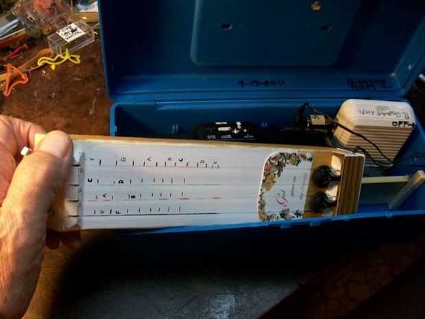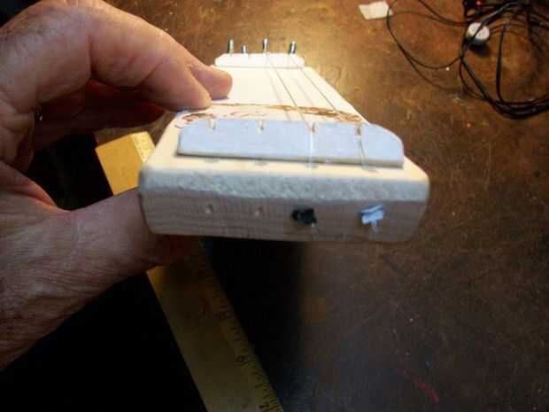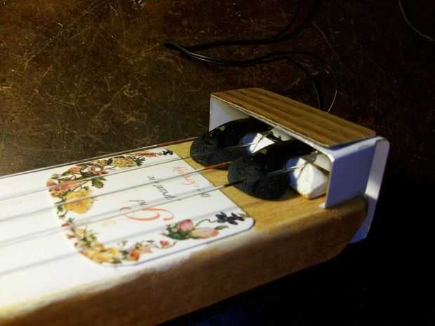 4-corte aproximadamente 15 pulgadas de 1 mm. cadena. Fije a la tuerca de mariposa con ojales de prensado. Viento aproximadamente 3 vueltas alrededor del clavo y tirar a otros iend e inserte a través de orificios y prensar después de tirar de la cadena a la nota deseada. Cadena Nº es nota E. {DGBE] E es la nota más alta: dos notas sobre el piano medio C.