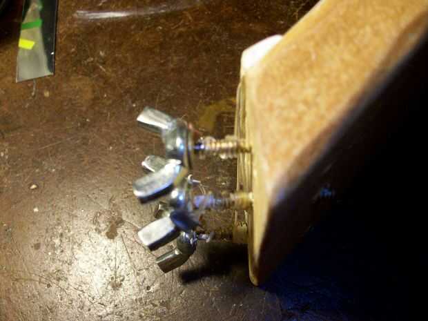 Taladro de 2 orificios al final del Tuner. Introduzca las uñas por martilleo. Cortar las protuberancias en la parte inferior. Pegamento en las tuercas de mariposa. Pegamento de gel.