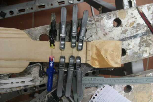 hice estos trastes partiendo los palillos de bambú y raspar la parte posterior plana más apagado con un cuchillo stanley. Sería útil si sus trastes son del mismo espesor y cortan antes de pegarlos en.  Si utilizas pegamento ayuda a endurecer los trastes para que no divide o desgastan tan rápido. Éste es pegada con cola de madera blanca estándar.