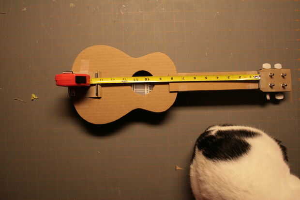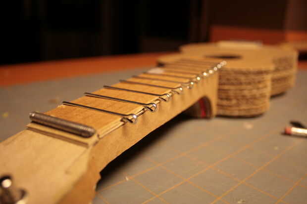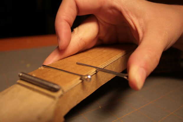 Instale los pasadores en cada uno de estos lugares. El pasador se asoman a través de cada una de las capas de corrugación en el diapasón, por lo que tomará alguna ligera presión y algo de paciencia. Si los pasadores no pone plana, puede que necesite usar algún pegamento de madera para sostener contra el diapasón. Si vas a utilizar el pegamento, doble Compruebe la ubicación de los trastes, no tendrás otra oportunidad.
