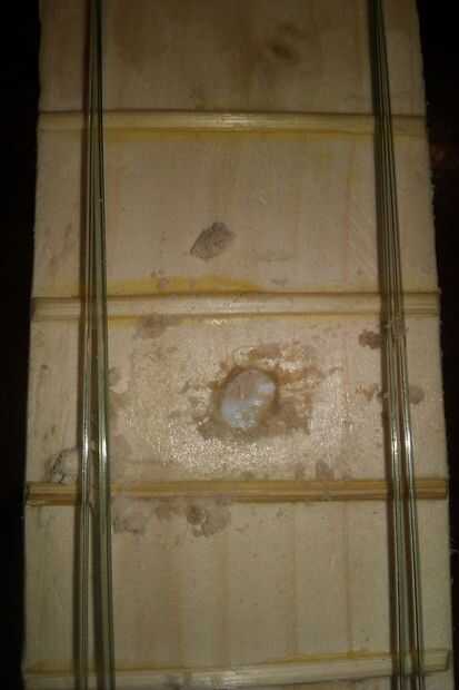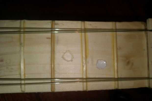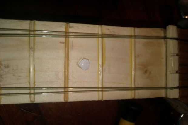 "Nacar" fue solo un roto poco pipi Shell traje volver conmigo de mi último viaje a la playa (un pipi es una pequeña almeja común en las playas Australianas). Rompí la cáscara hasta formó áspero en un poco de un círculo por recorte de trozos de cáscara con un par de pinzas redondear y alisar con lija. La forma del círculo se corta fuera de la cara de la Junta de traste (no muy bien) y la cáscara se presionó firmemente utilizando una abrazadera que entonces fue quitada y el pegamento aplicado. Papel de lija, añadiendo serrín fino y rellenar los huecos con aserrín seguido de superglue seguido de lijado más completan la tarea.