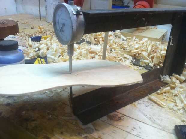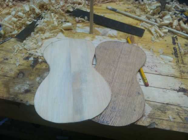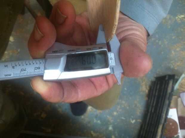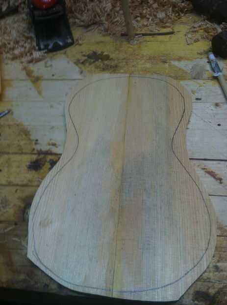 thicknessing arriba a.09 más planificación y raspar utilizo un calibrador del dial largo alcance para controlar el espesor en la parte superior no quiere un medio gordo y delgado los bordes. Este top es tipo de manchado de color pero qué vas a hacer. En este punto la parte superior y la parte posterior deben ser flexable y tienen un buen tono cuando aprovechado. Sostenga la madera cerca de la orilla cerca de mi oído y golpee fuertemente con mi punta de los dedos que desee escuchar un timbre agradable si no puede que necesite quitar algo más de madera.