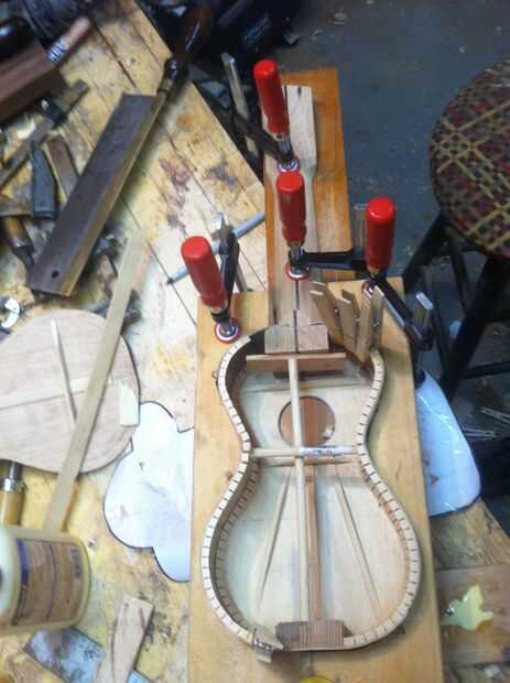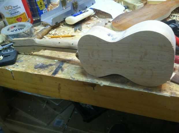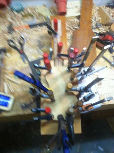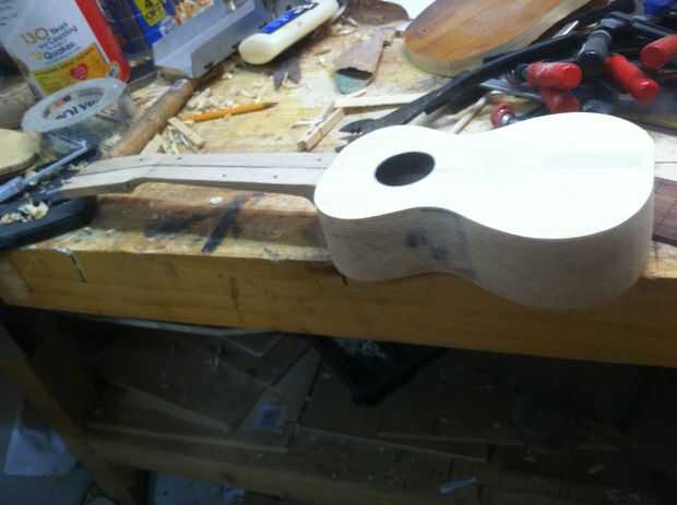 luego ingresé a la espalda. Aquí es donde comienza a ver como algo más que piezas de madera. Asegúrese de que el cuello y parte superior son perfectamente centradas y los lados son buenos y la Plaza (a 90 grados con la parte superior) antes de pegar en la parte posterior usar 1/4 tacos a frente y de lado a lado para esto. No es fácil conseguir un 10"palo largo fuera un 1Y 5/8" agujero de sonido.