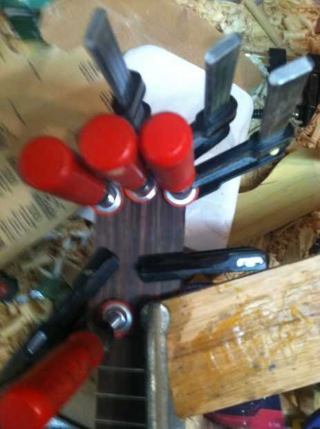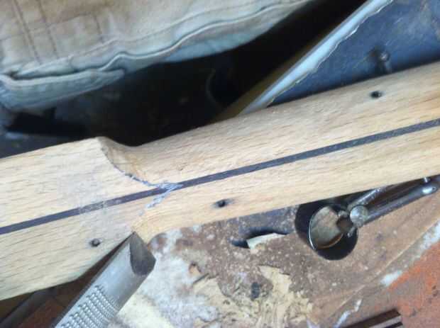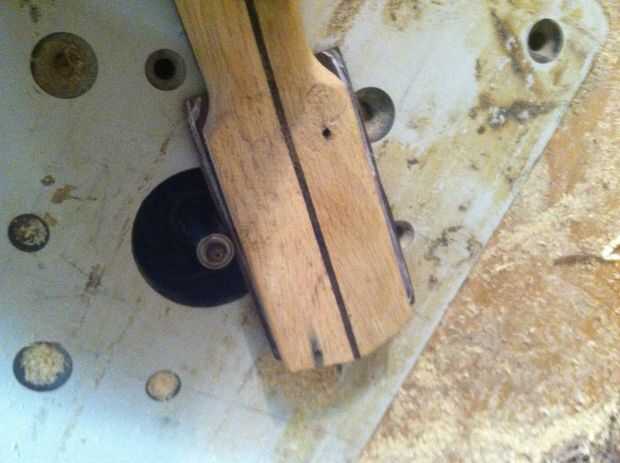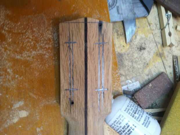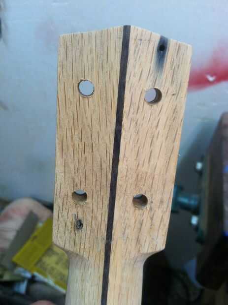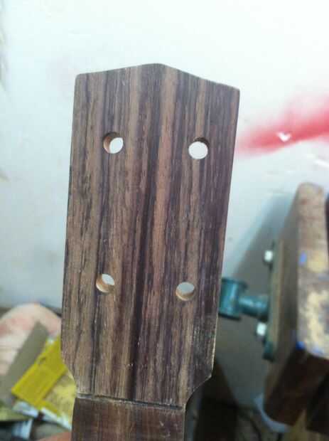 He pegado sobre un trozo de palo de rosa para la cabeza de la clavija y terminado la forma del cuello después de que perforó los agujeros para los sintonizadores