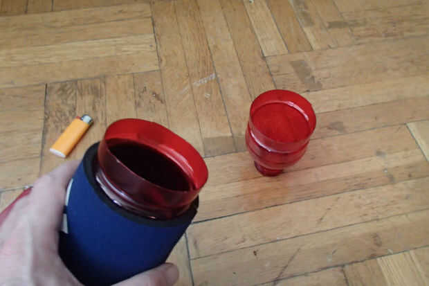 Cuando esté listo, retire el koozie. Entonces, toma el encendedor y apenas derretir el borde del plástico, asegurándose de fundirse sharp cosas y hacerla suave. Deja que se enfríe, reemplazar el koozie, añadir su bebida caliente o fría y disfrutar.