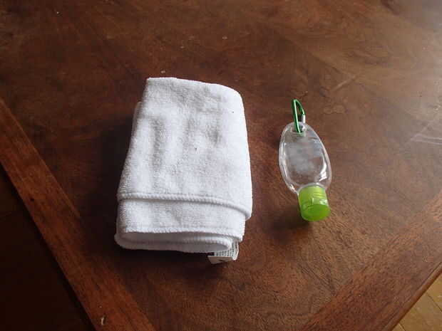 La botellita de squeezie celebró el desinfectante de la mano a la vez, ahora es Dr. Bronners. Sólo una toalla de microfibra poco conseguí en una tienda de automoción, cuando estaba comprando HEET.