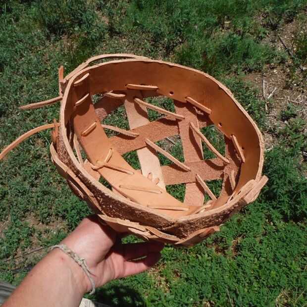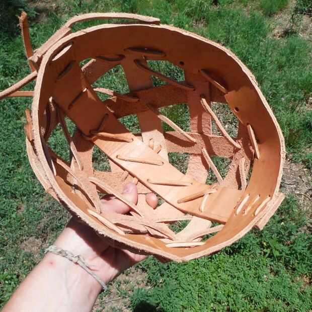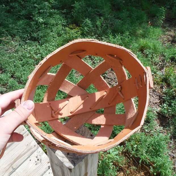 Apriete la cosa entera para arriba, perfora agujeros en cada esquina en las áreas de tejido y ejecutar un cordón alrededor del casco pasando por cada agujero. Esto hace una especie de fina red interna que se convierte en parte de las áreas de tejido.