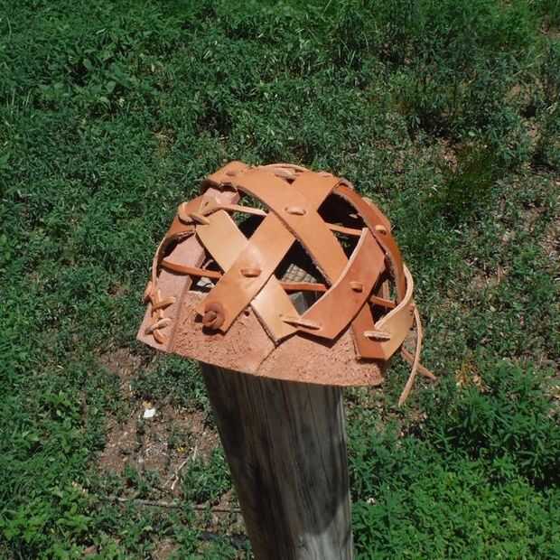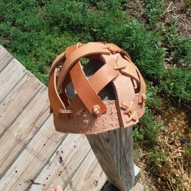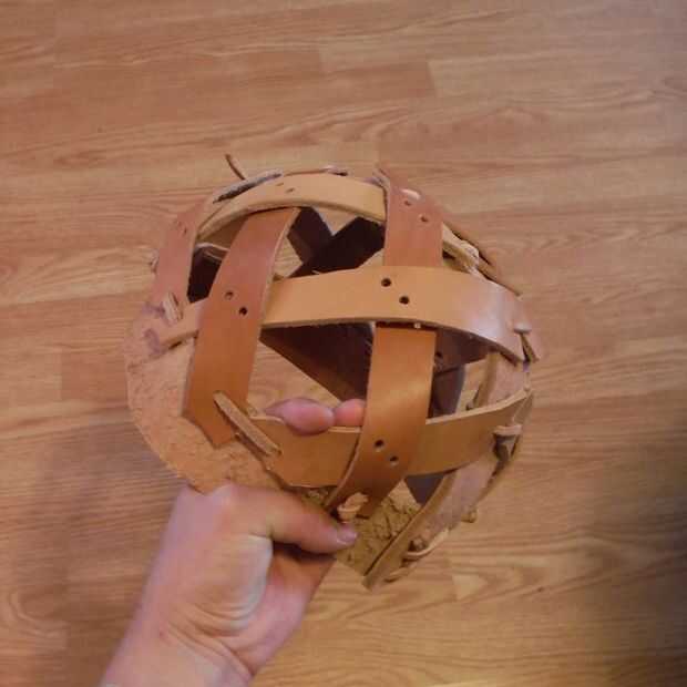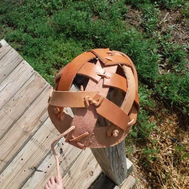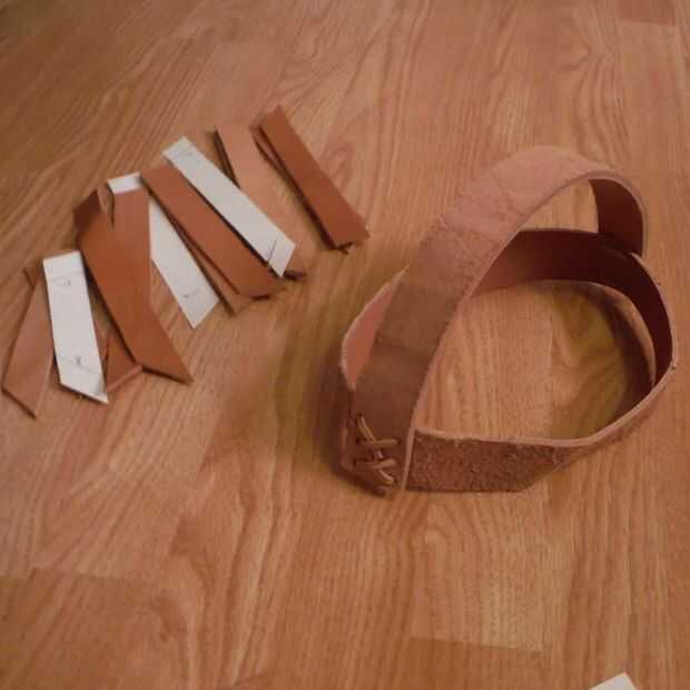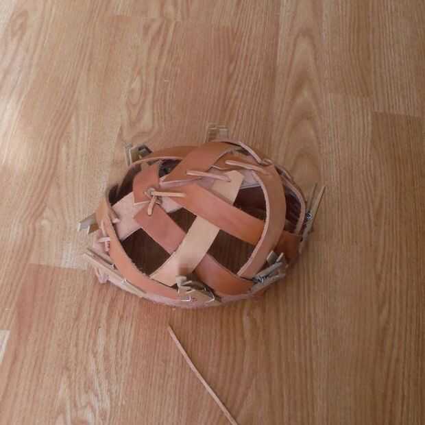 La Fundación del casco es la banda de la cresta y frente. Encaje los extremos de la ceja banda juntos de modo que forma un círculo y luego fije la banda de la cresta en los lados opuestos de la banda de la ceja que forma un medio círculo (ver imagen). Para las porciones visibles del casco, poner el lado de grano (lado liso) hacia fuera para una mejor apariencia.