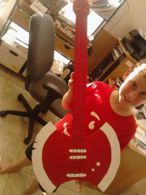 Ax de Marceline en forma de guitarra se hizo por sacar en la cartulina, recórtalo dos veces, unir las dos piezas para mayor estabilidad y pintarlo.