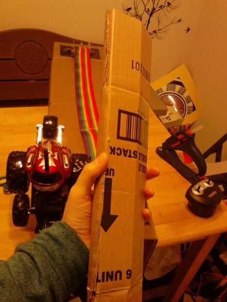 Inserte la tira pequeña de antes en el carrete y pruebe el ajuste en la base. (foto 16) El coche no permanece en el lugar así que tuve que construir en algún soporte para sostenerlo para arriba en el exterior. Primero corté dos tiras de cartón para alcanzar toda la corté. Pegue las dos tiras para hacer una tira gruesa y luego péguelo en el agujero en el borde de la base. (Foto 17 + 18) A continuación he añadido algo de apoyo en el exterior para el coche debajo de la rueda. Cortar una tira larga suficientemente amplia como para que quepa todo y doblar para que se pega para arriba para el coche. Pegamento caliente en el interior de la base. (fotos 19-22) Utilizar alguna cinta de pato para agregar extra hold. (Foto 23)